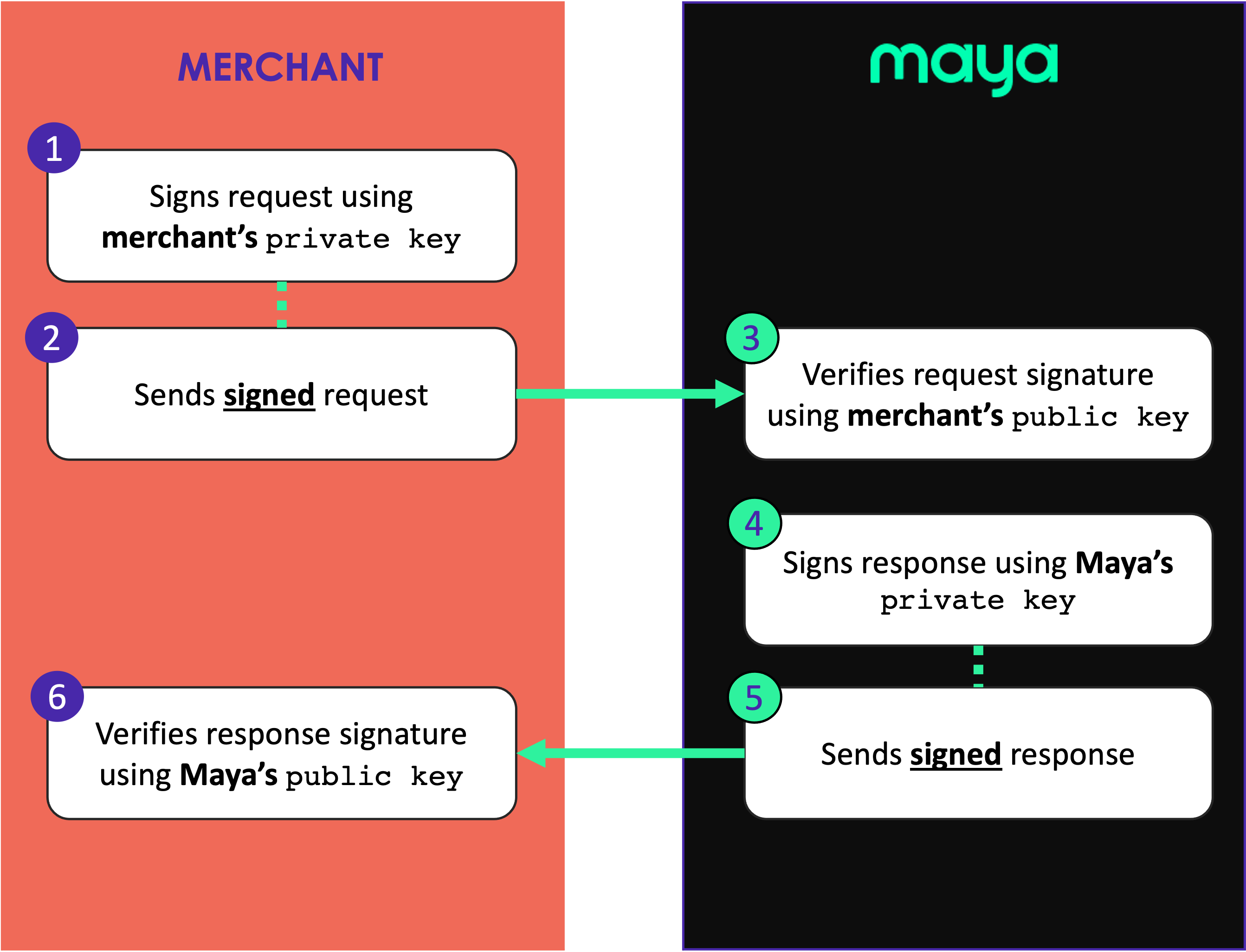 Digitally signing an API request is generally used to validate the integrity of data received from a server. Presented below is a high level diagram illustrating how merchants will do the signing of requests and the authentication of responses to and from public Maya APIs, using an asymmetric key scheme: