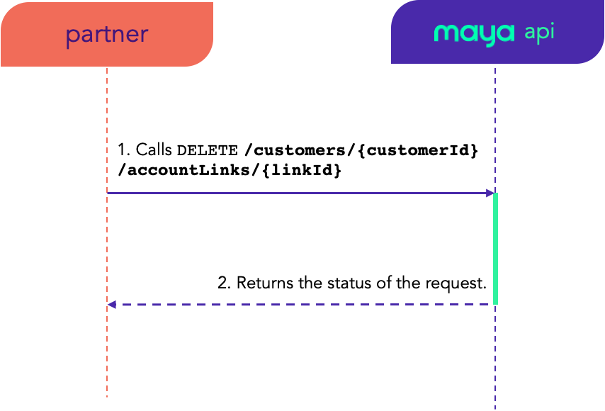 Upon successful call, Maya will delete the account linked to the customer record and returns the status of the request.