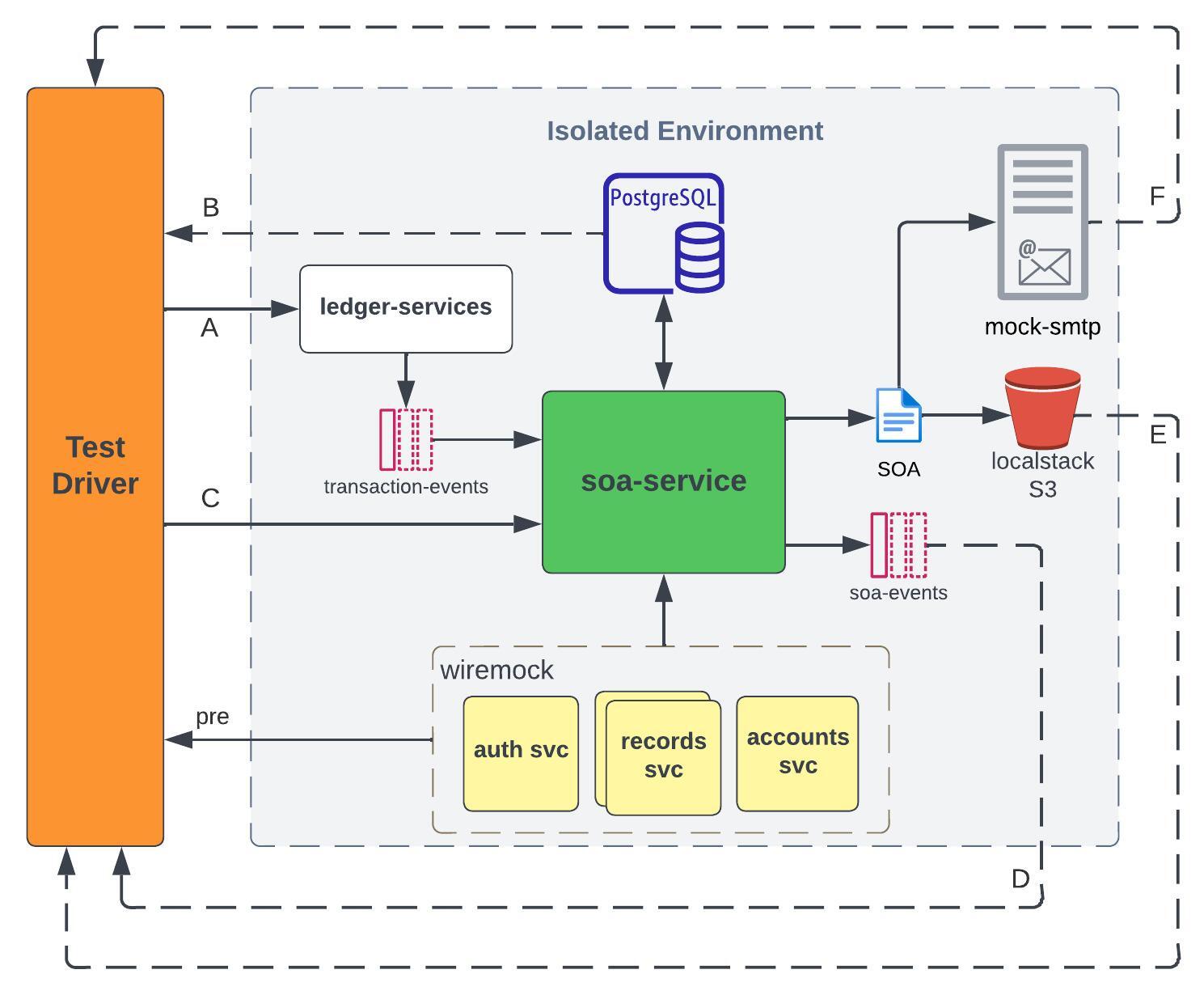soa-service(C), and the system pollssoa-eventstopic to get the status of the request (D). - For successful requests, the Test Driver downloads the SOA file from localstack S3 (E), and validates the contents based on the transactions from Step 1.